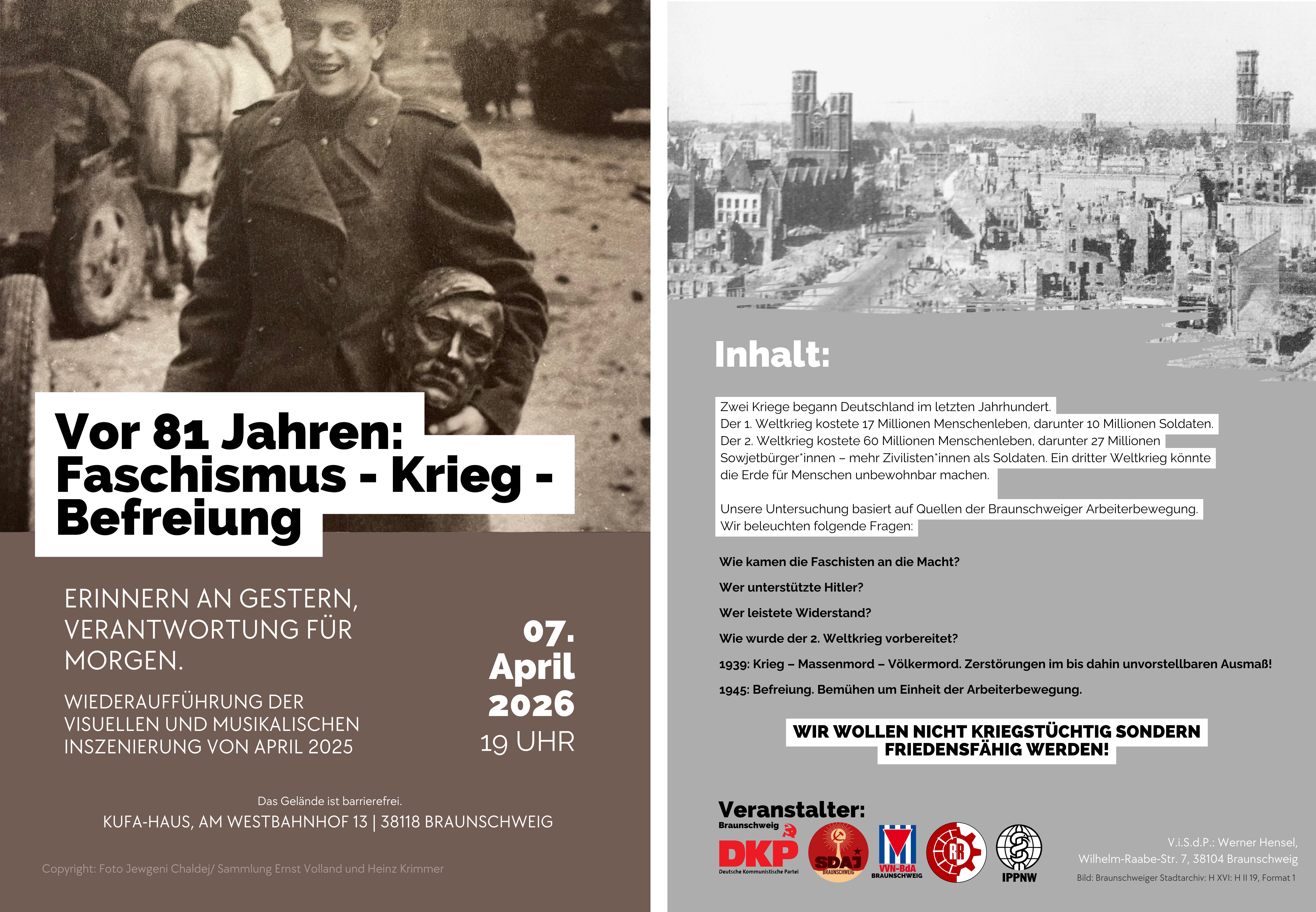 Unter dem eindringlichen Motto „Erinnern an Gestern, Verantwortung für Morgen“ laden wir gemeinsam mit anderen ins KUFA-Haus in Braunschweig zur Wiederaufführung der vielbeachteten visuellen und musikalischen Inszenierung ein. Die Veranstaltung am Dienstag, den 7. April 2026, um 19 Uhr, greift die historische Verantwortung auf, die sich aus den Katastrophen des 20. Jahrhunderts für die Gegenwart ergibt.